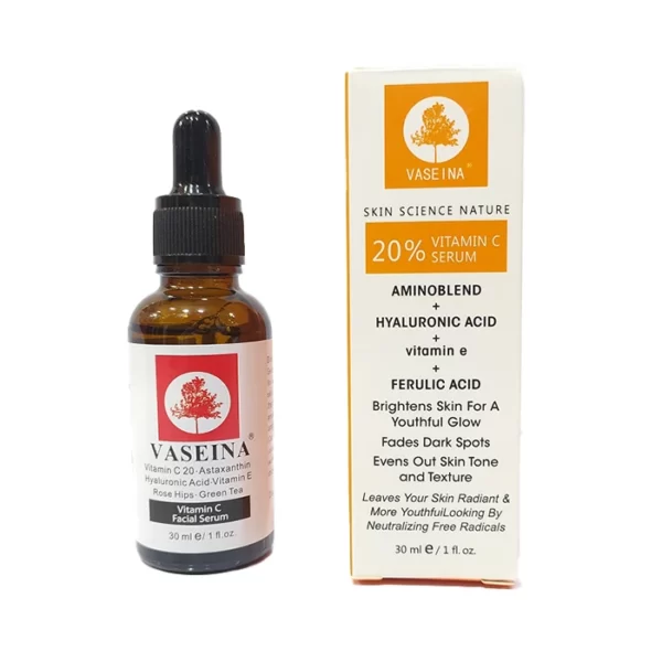 سرم صورت ویتامین سی واسینا برای پوست صورت شما ترکیبی ست از 20% ویتامین سی، ویتامین e، هیالورونیک اسید و فرولیک اسید. همچنین دارای عصاره درخت چای و میوه گل سرخ میباشد. این سرم آبرسان کاملاً طبیعی غنی از ویتامین C برای بهبود رنگ پوست صورت تان، خلاص شدن از شر آکنه ها و جوان تر به نظر رسیدن پوست بسیار مناسب می باشد.